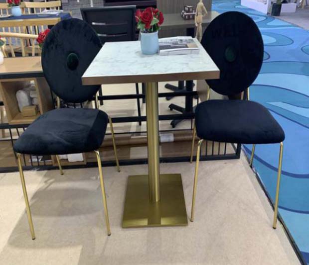 ,材质是碳钢,整体给人一种有点冷淡风的风格,搭配上橡木桌面和大理石桌面,整体一种很简单又不失大气的搭配,适用于餐厅